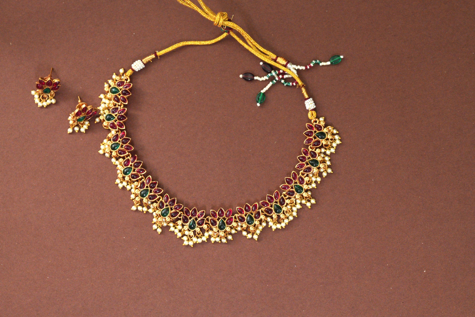 The Padmita Necklace Set blooms with elegance, featuring vibrant red and green petal-shaped stones arranged in a radiant floral pattern. Enhanced with dainty pearl hangings and an antique gold finish, this set is perfect for weddings, festivals, and traditional occasions.
