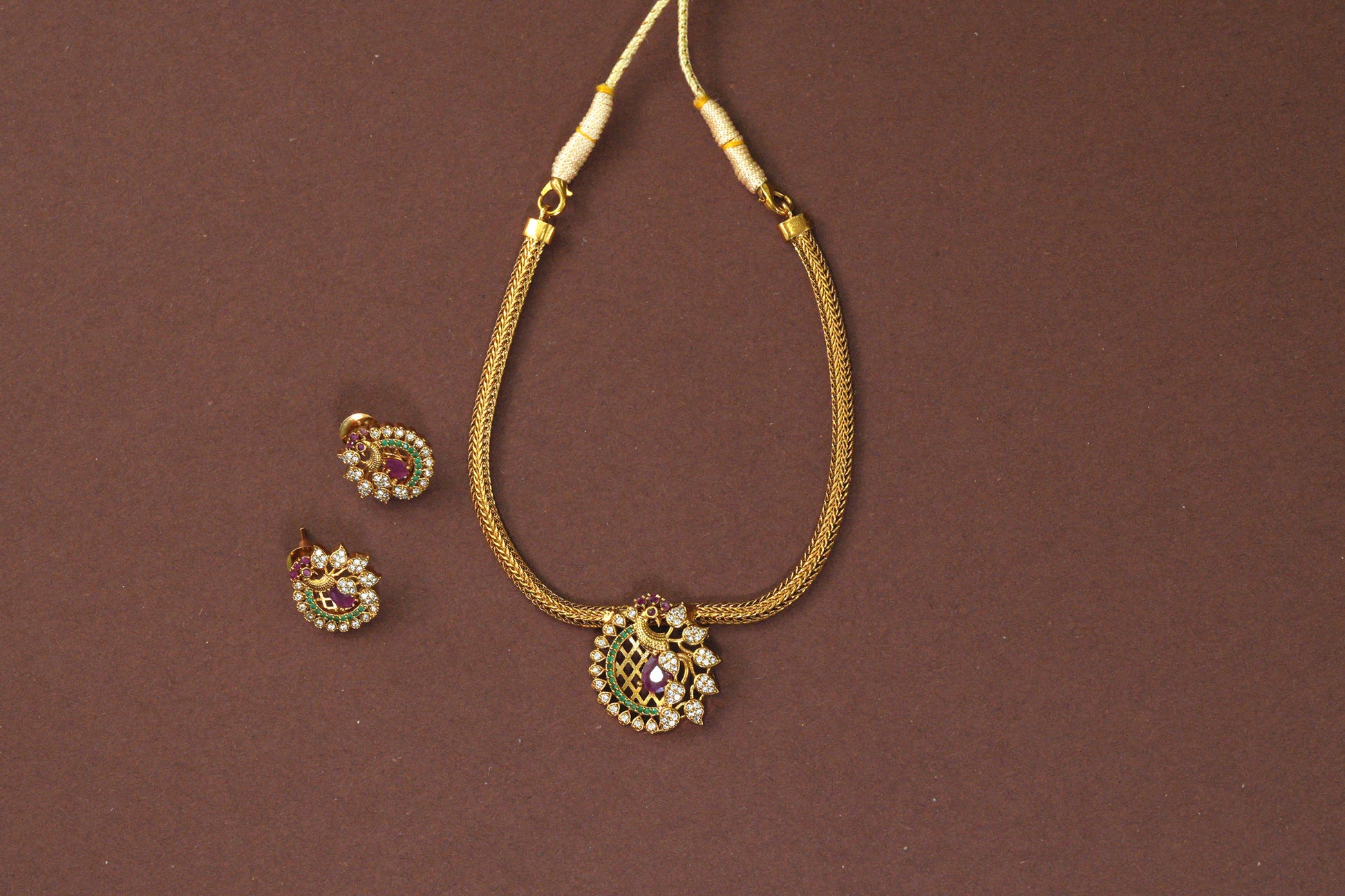 Grace meets sparkle in our Peacock Glow Necklace Set, crafted with shimmering AD stones, ruby and emerald detailing, and an intricately designed peacock motif. The sleek golden chain and matching earrings make it a classy yet festive addition to your collection.