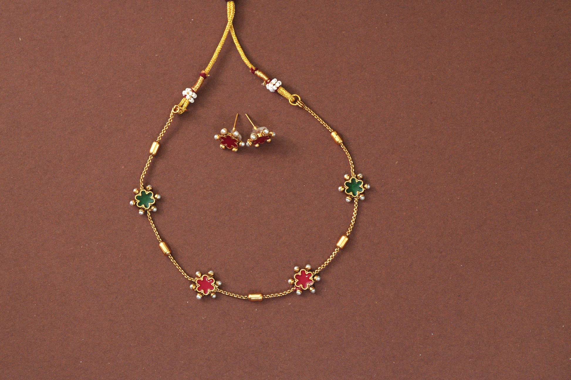 Add a playful touch of tradition to your look with our Phoolika Enamel Necklace Set. This lightweight gold-tone chain is adorned with charming floral enamel accents in alternating shades of deep red and green, beautifully complemented by matching stud earrings. The delicate craftsmanship and pop of color make it perfect for both festive occasions and everyday elegance.