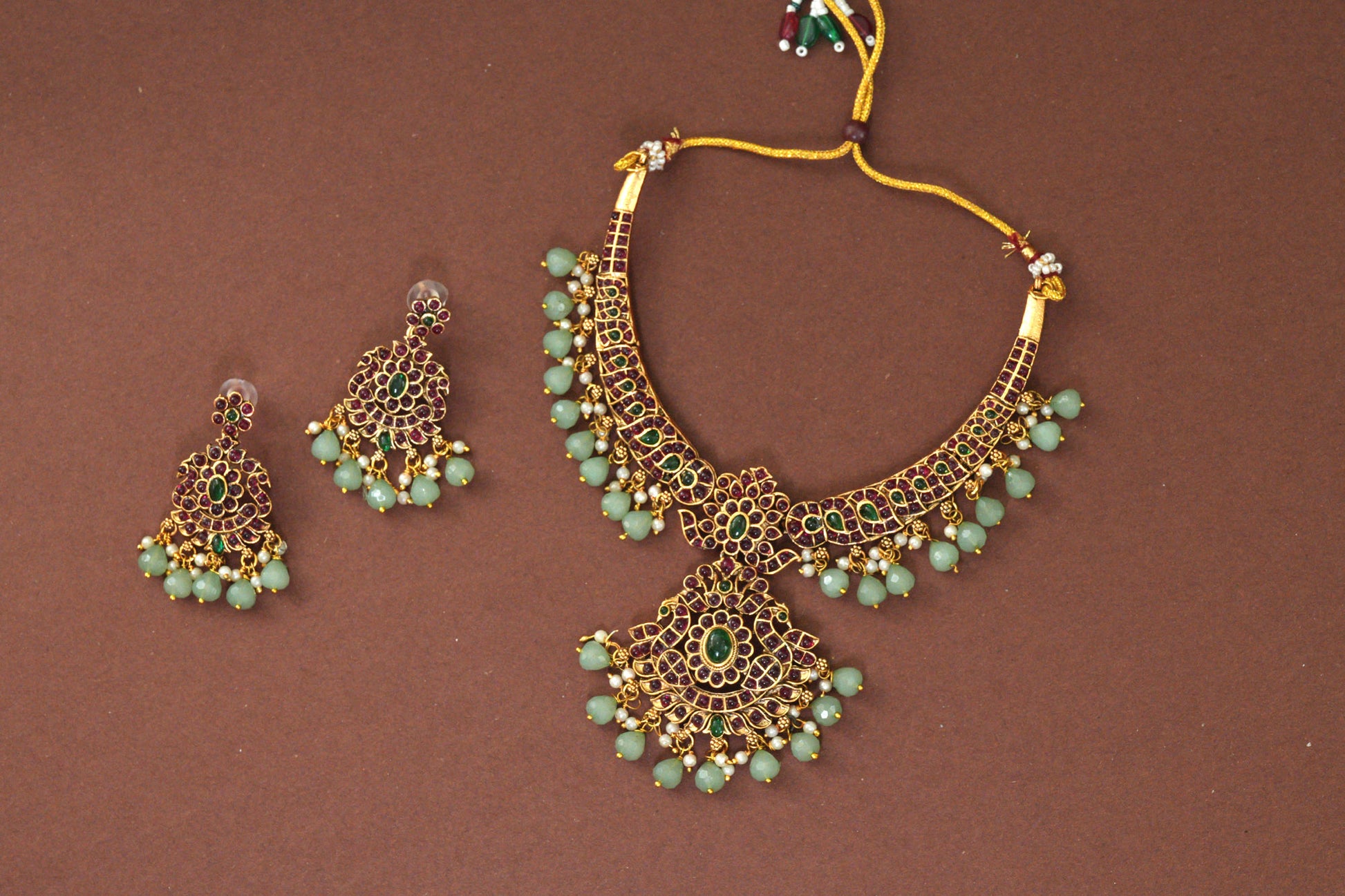 This vibrant Chandbali-style necklace set features stunning ruby-red and emerald green stones, beautifully arranged in a traditional pattern. The necklace and matching earrings are enhanced with mint green bead drops, adding a graceful touch to your festive or bridal look.