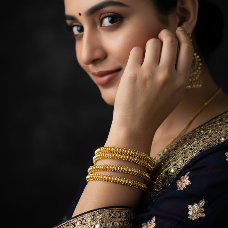 These bangles add a regal charm to festive and bridal looks alike. Designed for long-lasting beauty, each piece comes with a polish guarantee, ensuring your bangles retain their golden glow for years.